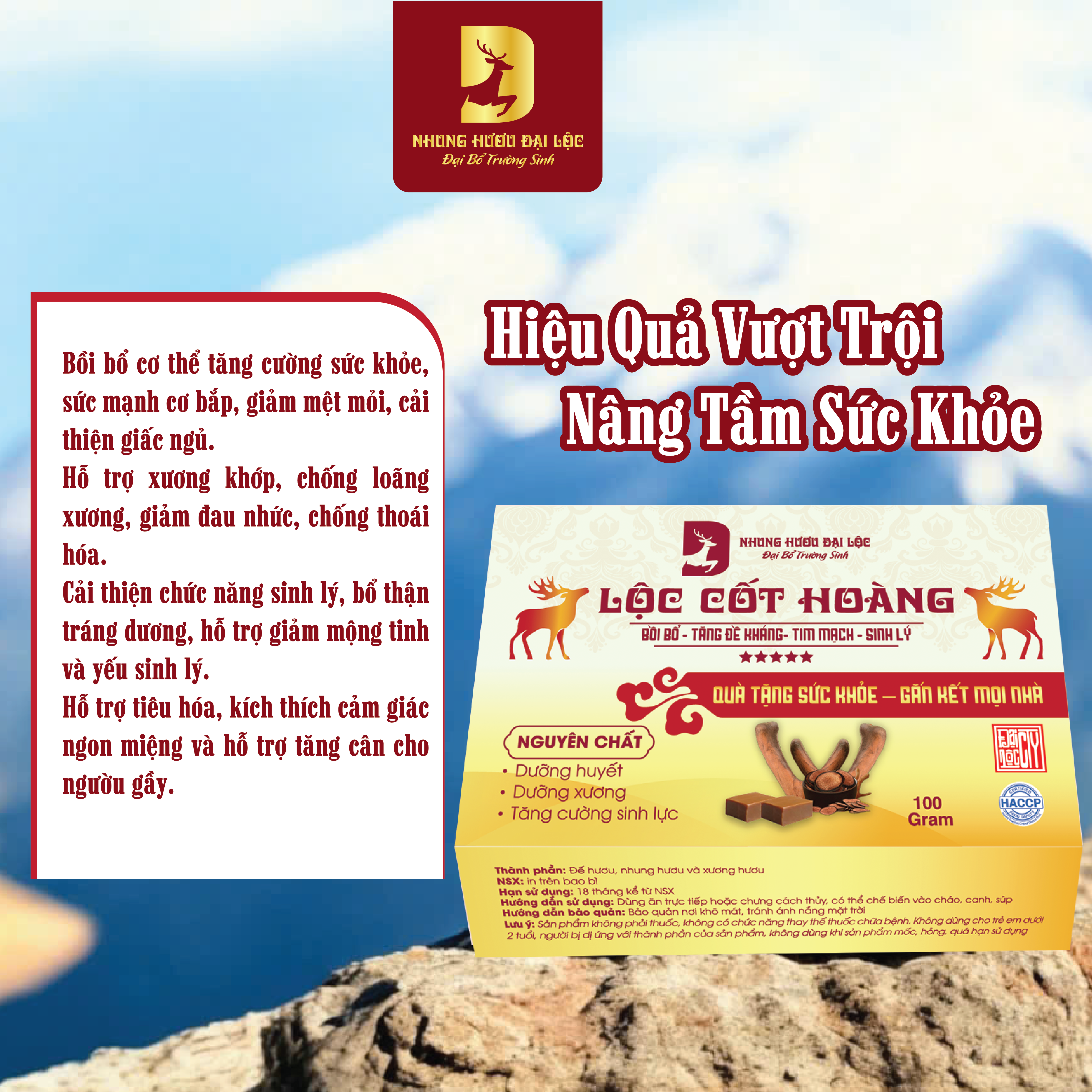 - Nhung hươu thượng hạng: Nguồn cung cấp dồi dào các dưỡng chất quý hiếm như Pantocrin, Collagen, Axit amin, Vitamin (B, D, E…) và khoáng chất, giúp bồi bổ sức khỏe toàn diện từ bên trong.